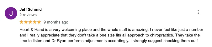 Disclaimer: Procedures and treatments performed by Heart & Hand Chiropractic have an inherent success (and failure) rate. Reviews, testimonials and content on this site should not be interpreted as a statement of efficacy of procedures and treatments performed by Heart & Hand Chiropractic for anyone else.